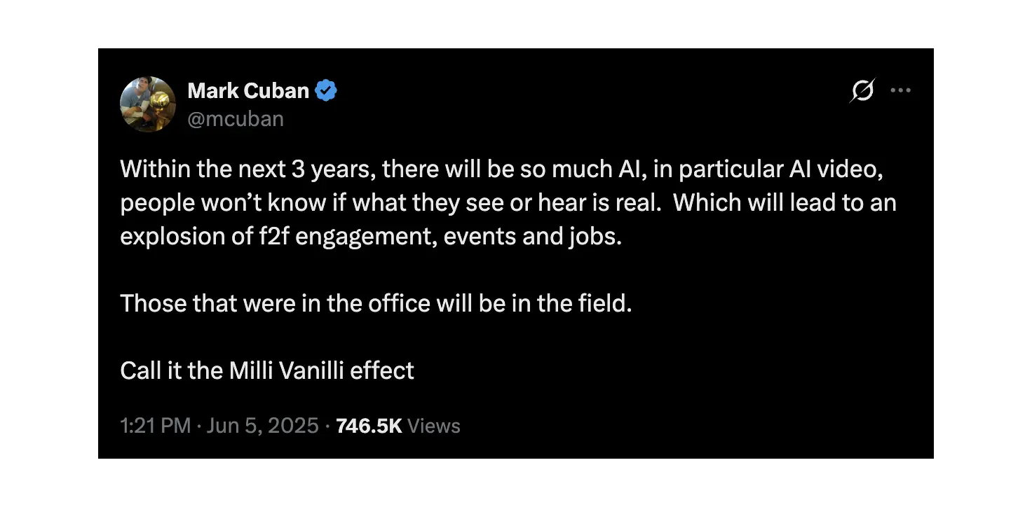 The demand for in-person events is increasing. As digital noise continues to rise, brands are turning to real-world moments to create lasting connections. Video plays a crucial role in that by capturing stories, energy, and emotion that audiences carry long after the event ends. Even Mark Cuban considers events as the bridge between AI and the disconnect of human interaction | Mark Cuban Tweet
